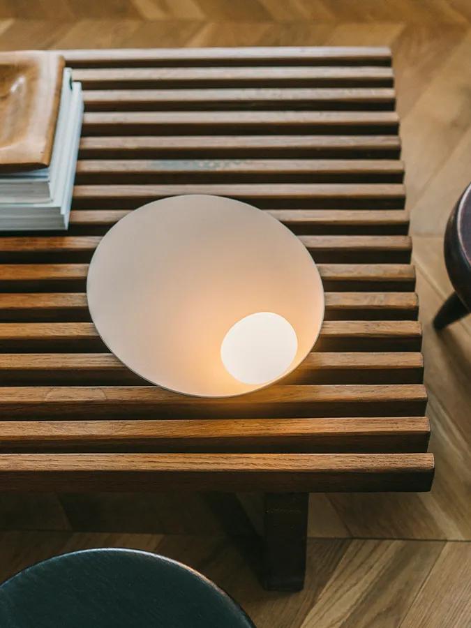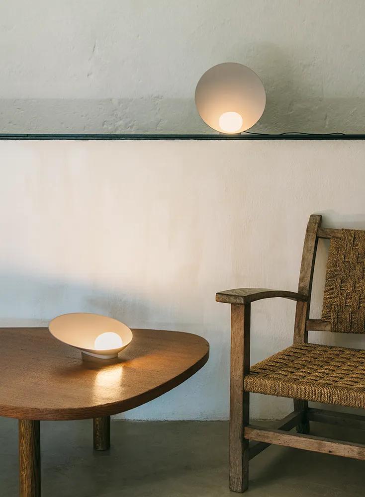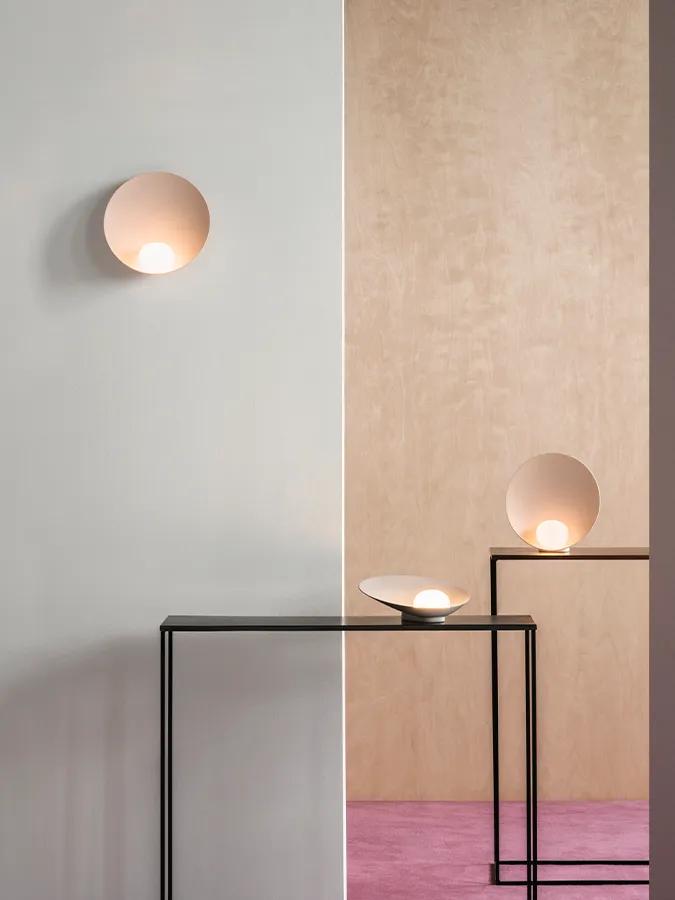 A delicate and elegant design where an interaction is established between the light emitted by the small opal blown-glass sphere and the light reflected by the dish that embraces it.