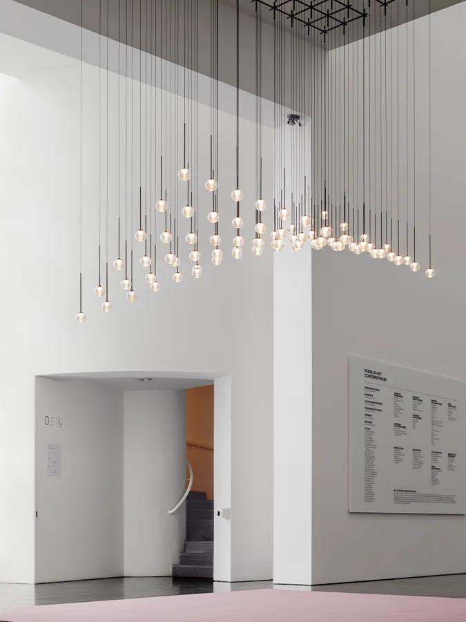 This series blends beauty and geometry into a lighting system filled with a sense of magic. Algorithm Grid combines geometric precision with sensory delicacy. The collection features configurations of glass spheres, suspended at varying heights and anchored to the ceiling by a floating tubular structure. In its Grid version, the mouth-blown glass spheres align in a perfect grid, creating a rhythmic composition that brings structure without compromising lightness. Ideal for projects requiring formal coherence and a warm atmosphere, it is a luminaire that transforms order into visual poetry.