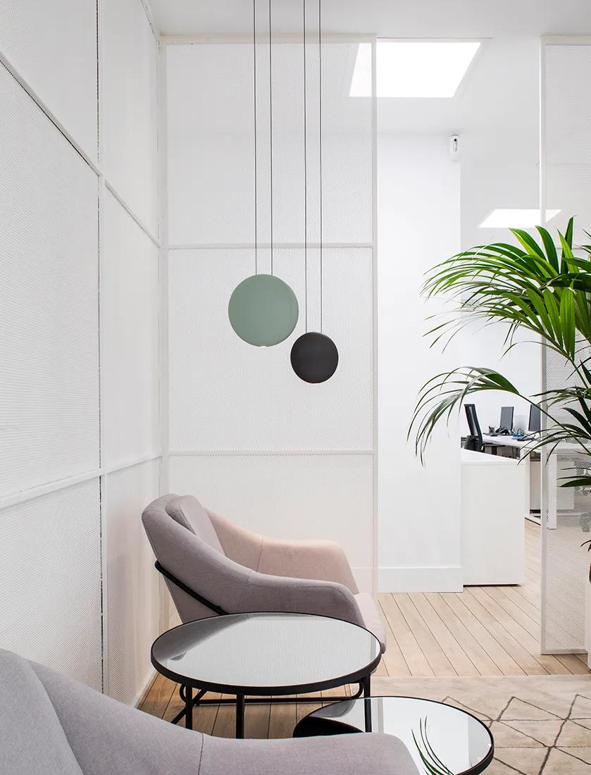 The Cosmos collection consists of pendant light clusters, flattened forms of different sizes that create an optical illusion of hanging spheres that appear to be floating in the air.