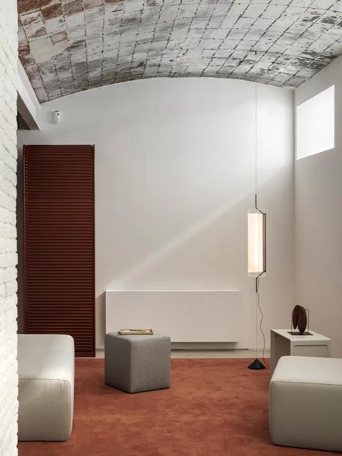 The pendant versions—available in vertical, horizontal, and circular compositions—are defined by their concealed light source and almost intangible presence. Suspended in space, they cast a precise and enveloping light that redefines the perception of volume. With a sober yet expressive design, they are versatile pieces suited to contemporary architecture.
