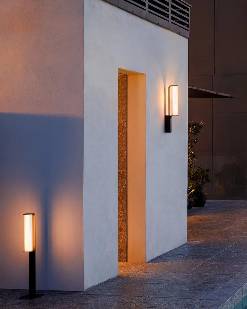 Its translucent glass tube is fluted, defined by uniform grooves that allow the light to pass softly through while the source remains concealed. Each of the tubes of the Class outdoor wall luminaire is supported by a robust aluminium shaft, its matte black finish contrasting with the smooth surface of the glass tubes. The result: a pleasing combination of textures that recalls the traditional gas lamp.
