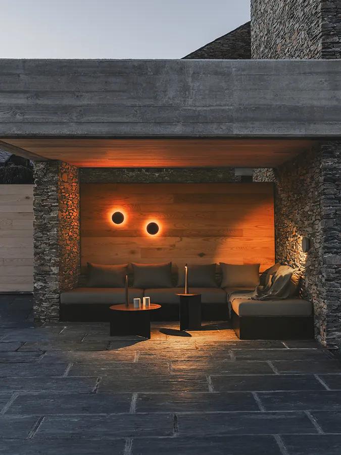 The Dots Outdoor wall sconces can be arranged individually to highlight specific features or collectively to create intricate patterns of beams and halos.